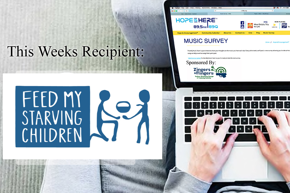 Take the 89Q music survey this week and benefit Feed My Starving Children. Feed My Starving Children mobilizes volunteers in local communities to pack meals that can be sent to hungry children around the world. The Music Team Survey is sponsored by Zingers and Flingers.